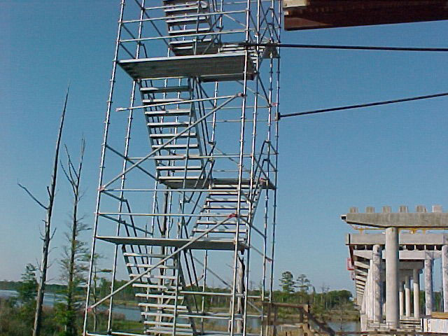 Our bridge stair tower scaffold is engineered with our System Scaffold, allowing for maximum efficiency in meeting scheduled deadlines with safe, efficient access. The hot-dipped galvanize finish on our bridge scaffold products allow for protection and durability. Our bridge building scaffold is comprised of a custom manufactured blend of Endlok Tube and Clamp Scaffolding, Universal System Scaffold and custom fabricated products to meet your job-specific specifications.